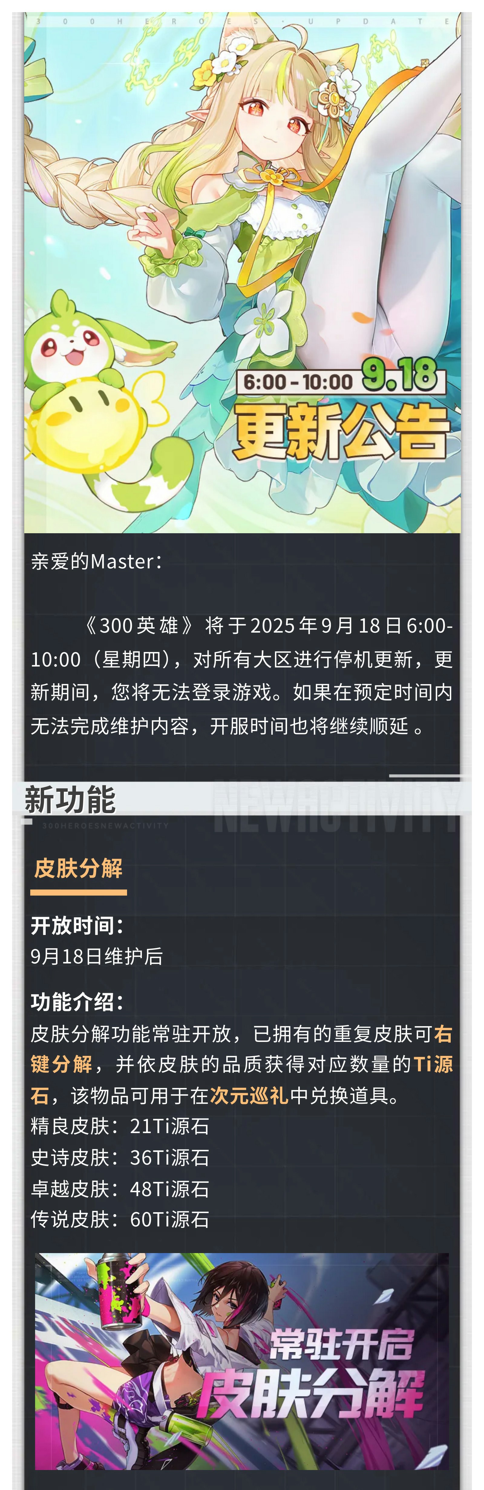 《300英雄》将于2025年9月18日6:00-10:00(星期四),对所有大区进行停机更新,更新期间,您将无法登录游戏。如果在预定时间内无法完成维护内容,开服时间也将继续顺延。