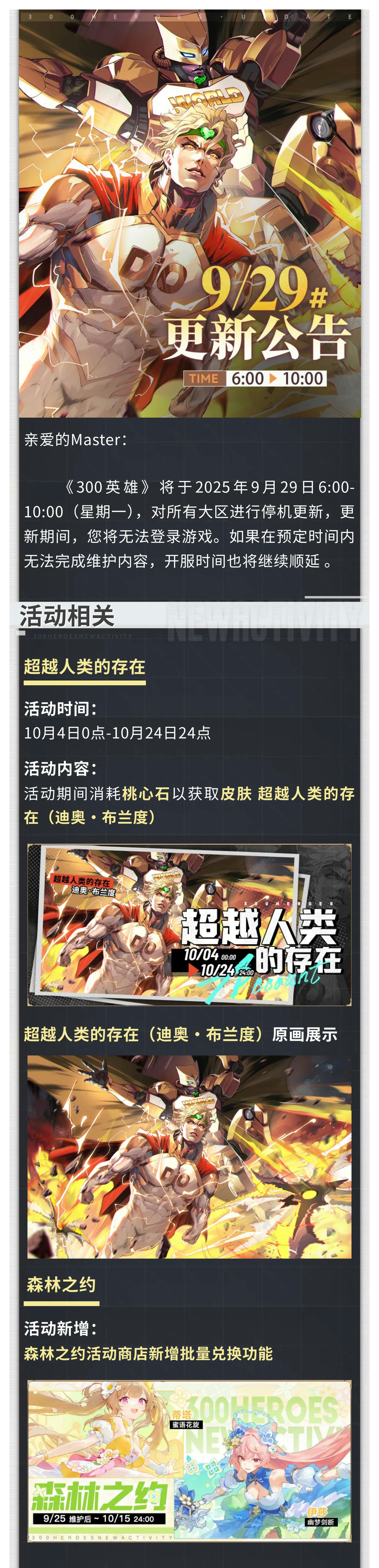 《300英雄》将于2025年9月29日6:00-10:00(星期一),对所有大区进行停机更新,更新期间,您将无法登录游戏。如果在预定时间内无法完成维护内容,开服时间也将继续顺延。