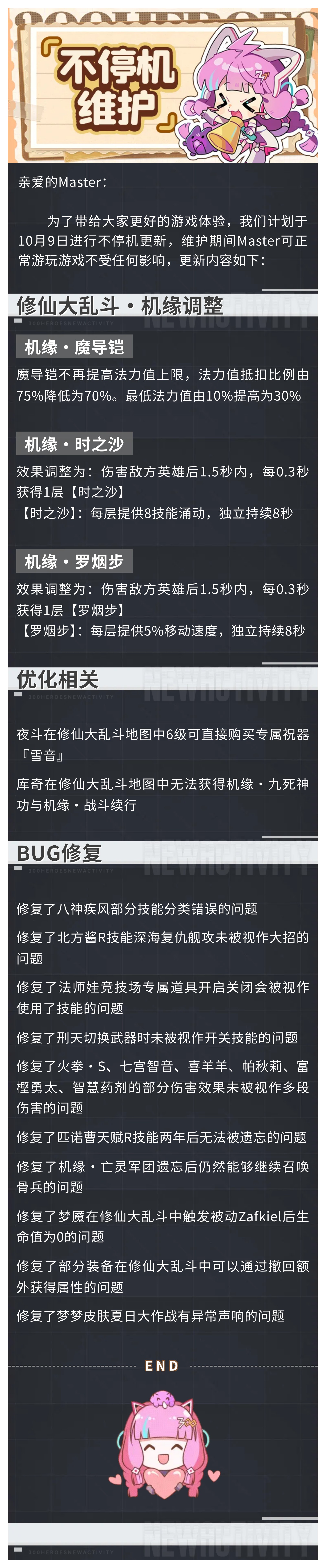 为了给大家带来更好的游戏体验,我们计划于10月9日进行不停机更新,维护期间Master可正常游玩游戏不受任何影响。更新内容如下: