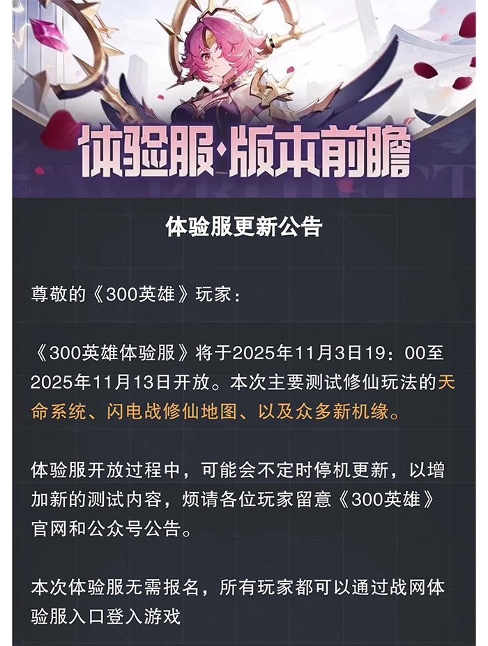 《300英雄体验服》将于2025年11月3日 19:00 至 2025年11月13日开放。本次主要测试修仙玩法的天命系统、闪电战修仙地图、以及众多新机缘。
