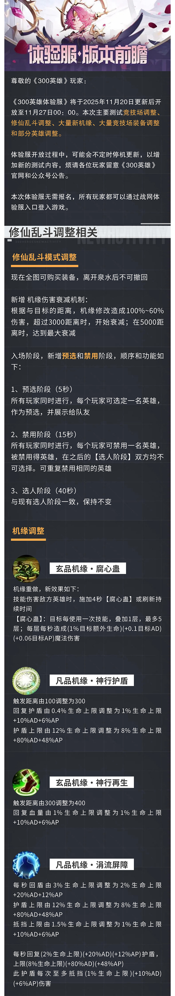 《300英雄体验服》将于2025年11月20日更新后开放至11月27日00:00。本次主要测试竞技场调整、修仙乱斗调整、大量新机缘、大量竞技场装备调整和部分英雄调整。