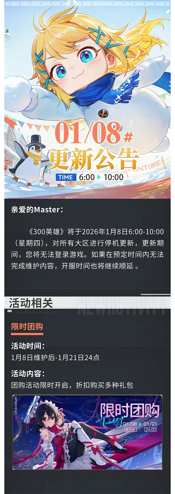 《300英雄》将于2026年1月8日6:00-10:00(星期四),对所有大区进行停机更新,更新期间,您将无法登录游戏。如果在预定时间内无法完成维护内容,开服时间也将继续顺延。