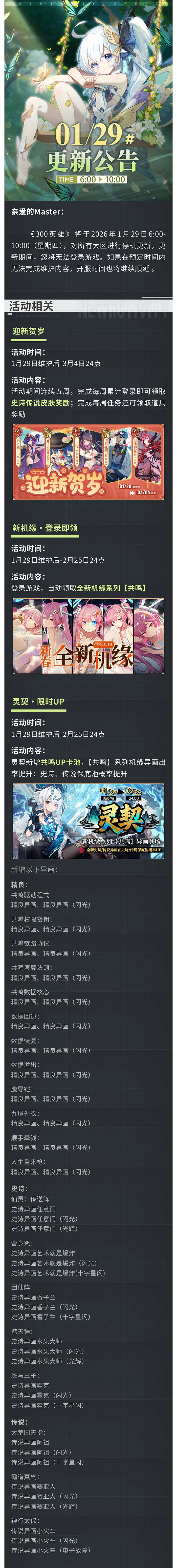 《300英雄》将于2026年1月29日6:00-10:00(星期四),对所有大区进行停机更新,更新期间,您将无法登录游戏。如果在预定时间内无法完成维护内容,开服时间也将继续顺延。