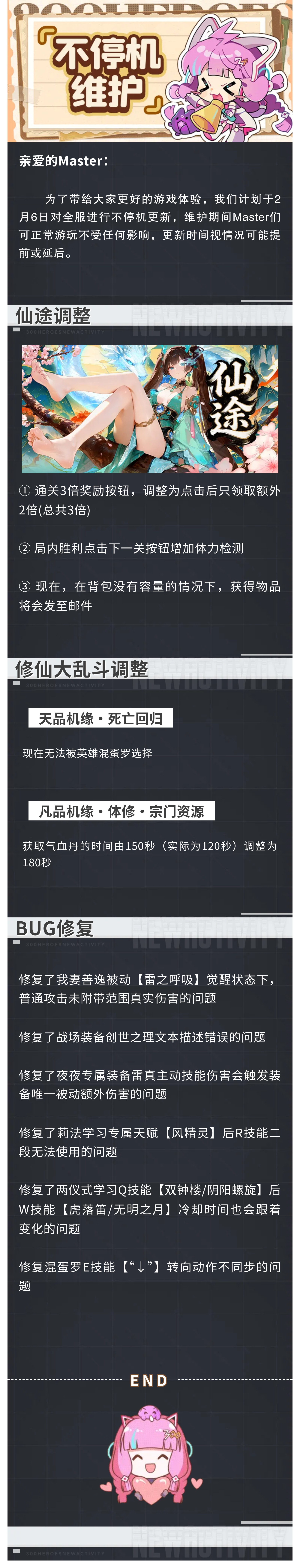 为了带给大家更好的游戏体验,我们计划于2月6日对全服进行不停机更新,维护期间Master们可正常游玩不受任何影响,更新时间视情况可能提前或延后。