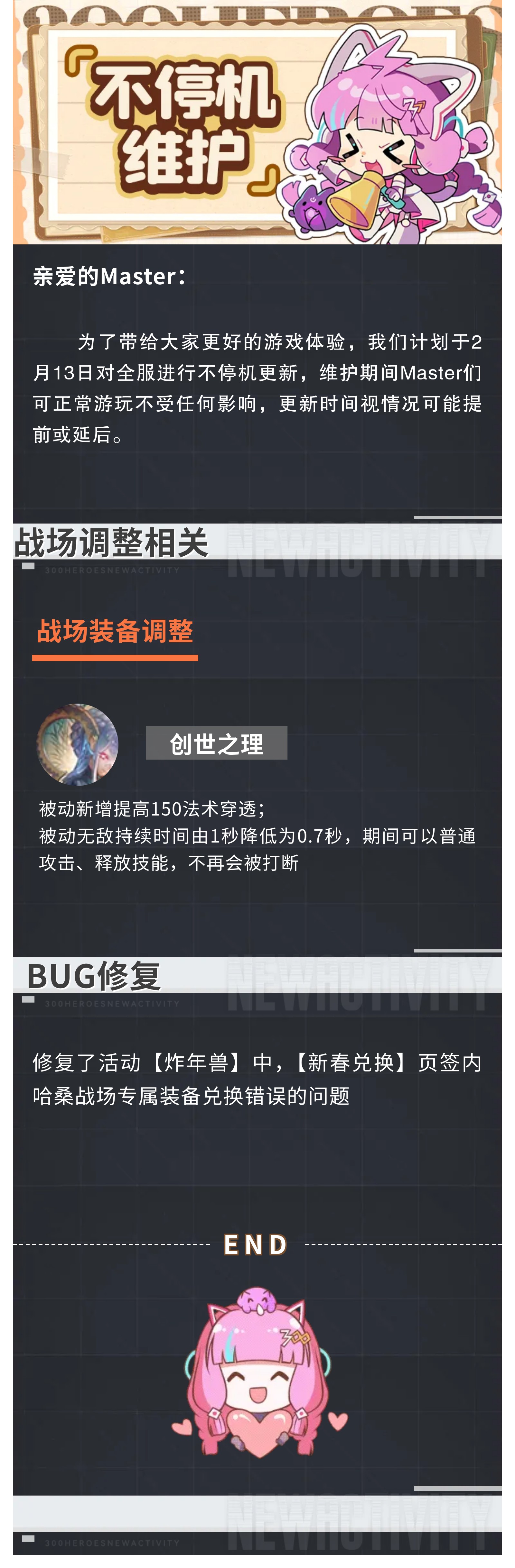 为了带给大家更好的游戏体验,我们计划于2月13日对全服进行不停机更新,维护期间Master们可正常游玩不受任何影响,更新时间视情况可能提前或延后。