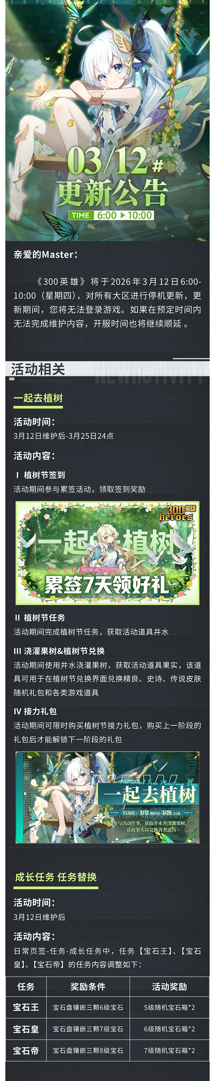 《300英雄》将于2026年3月12日6:00-10:00(星期四),对所有大区进行停机更新,更新期间,您将无法登录游戏。如果在预定时间内无法完成维护内容,开服时间也将继续顺延。
