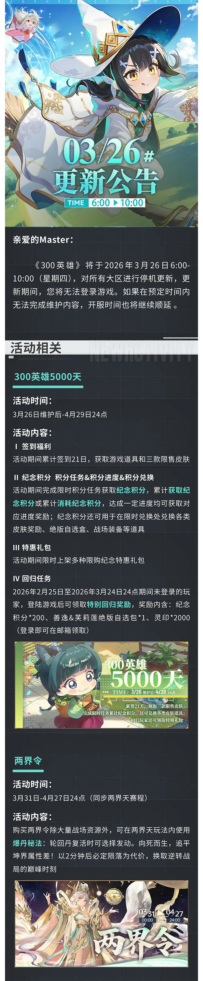 《300英雄》将于2026年3月26日6:00-10:00(星期四),对所有大区进行停机更新,更新期间,您将无法登录游戏。如果在预定时间内无法完成维护内容,开服时间也将继续顺延。