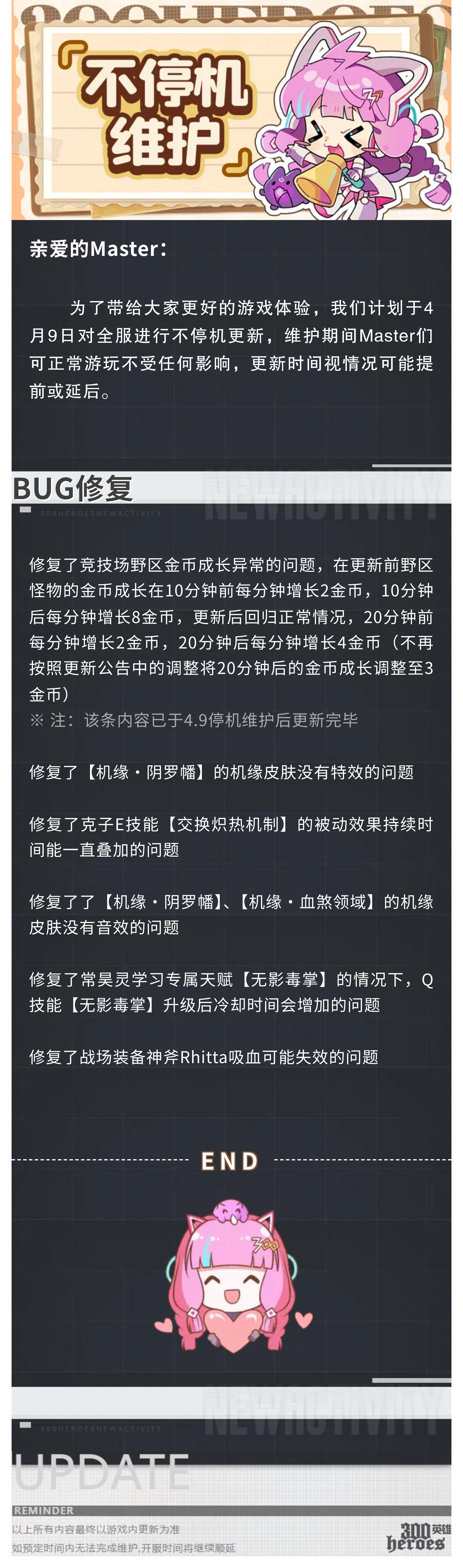 为了带给大家更好的游戏体验,我们计划于4月9日对全服进行不停机更新,维护期间Master们可正常游玩不受任何影响,更新时间视情况可能提前或延后。