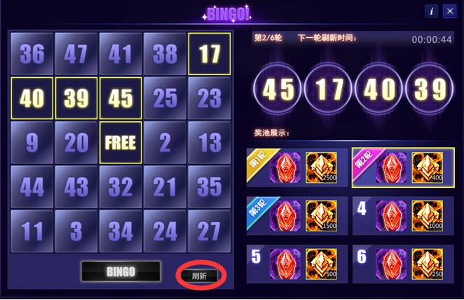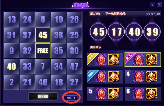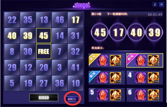 答:直接点击刷新即可刷新左边bingo数字除锁定数字和FREE数字外所有数字,每天有2次免费刷新机会。用完就没啦,土豪任性也买不到!