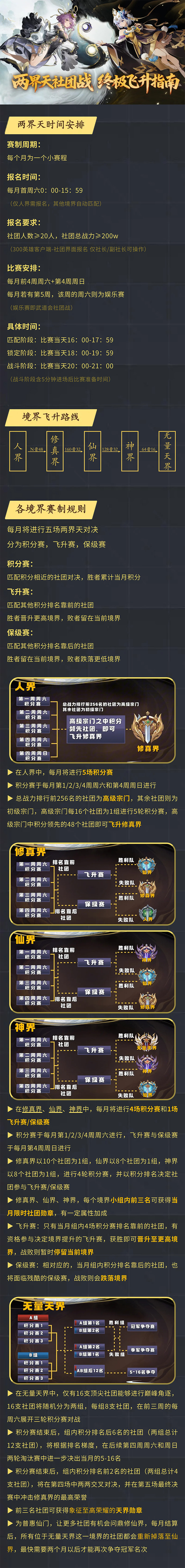 两界天时间安排,境界飞升路线,各境界赛制规则,赛事初期特殊晋升规则,奖励构成……省流一图流!