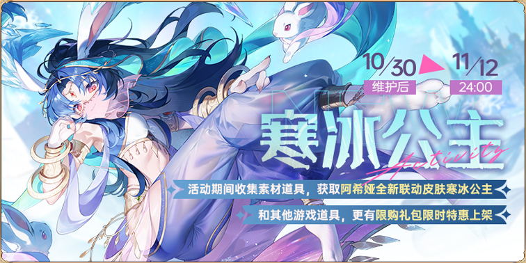 活动内容:活动期间收集素材道具,获取阿希娅全新联动皮肤寒冰公主和其他游戏道具,更有限购礼包限时特惠上架!