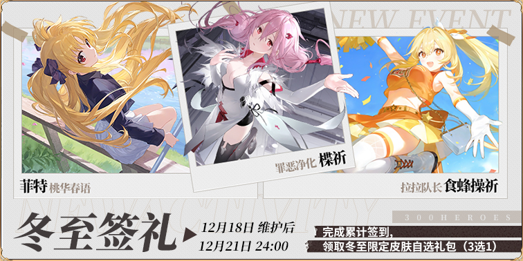 活动内容:活动期间完成累计签到,获取每日签到奖励和冬至限定皮肤自选礼包(3选1)