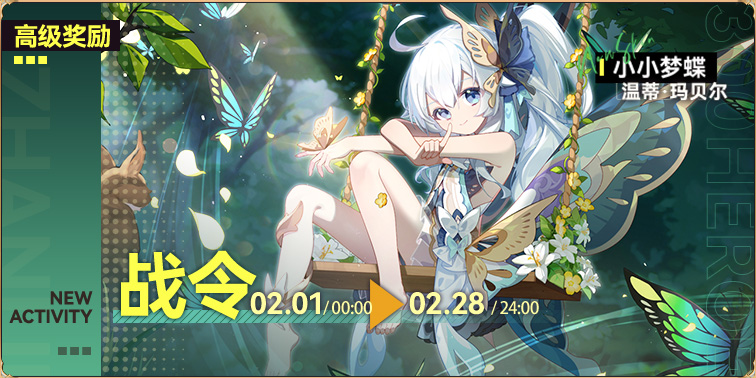 活动内容:完成战令任务,提升战令等级,获取对应奖励。购买高级奖励解锁皮肤 小小梦蝶(温蒂·玛贝尔)并开放新增的限定商品购买
