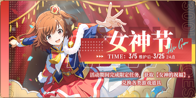 活动内容:活动期间完成限定任务,获取女神的祝福,该物品可用于兑换各类游戏道具;商城限时特售女神节限定礼包
